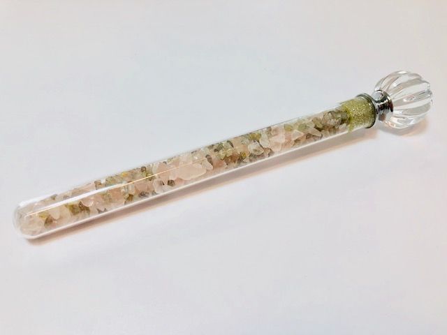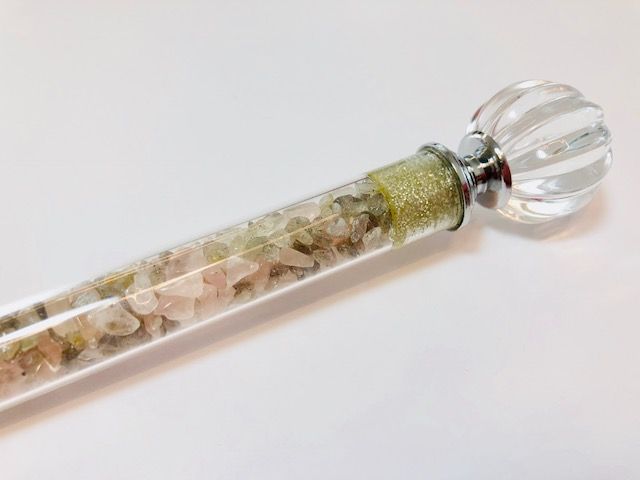 Der Stab ist 19cm lang und hat an einem Ende eine wunderschöne von mir persönlich energetisierte Glaskugel zur Wirkverstärkung.
