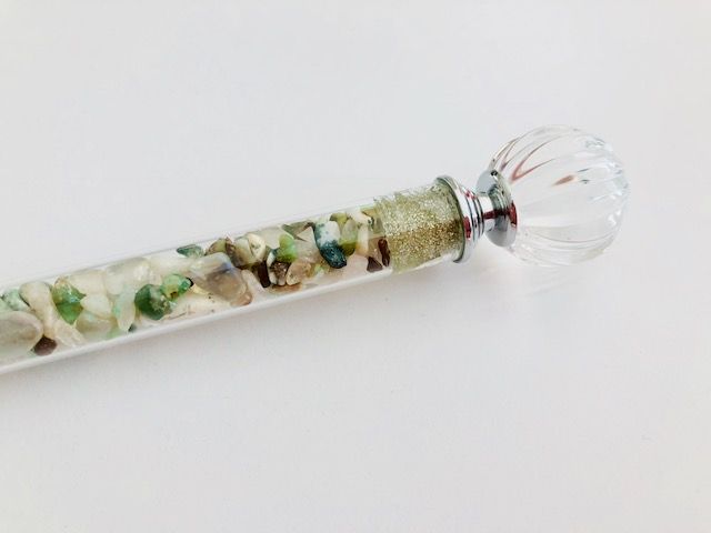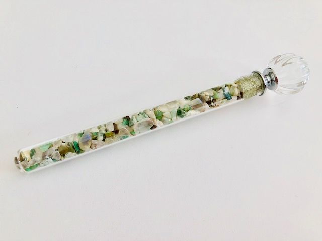 Der Stab ist 19cm lang und hat an einem Ende eine wunderschöne von mir persönlich energetisierte Glaskugel zur Wirkverstärkung.