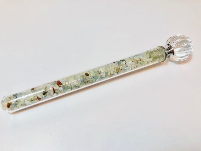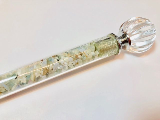 Der Stab ist 19cm lang und hat an einem Ende eine wunderschöne von mir persönlich energetisierte Glaskugel zur Wirkverstärkung.