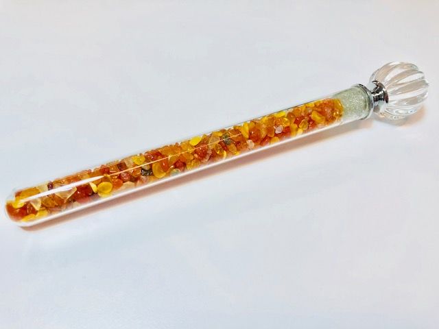 Der Stab ist 19cm lang und hat an einem Ende eine wunderschöne von mir persönlich energetisierte Glaskugel zur Wirkverstärkung.