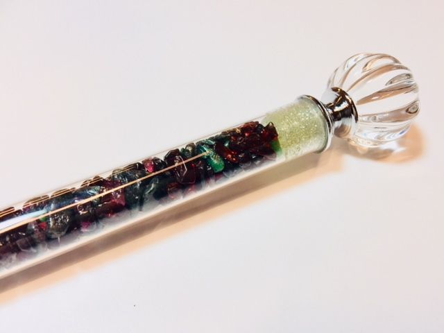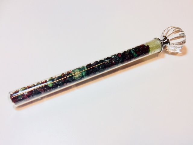 Der Stab ist 19cm lang und hat an einem Ende eine wunderschöne von mir persönlich energetisierte Glaskugel zur Wirkverstärkung.