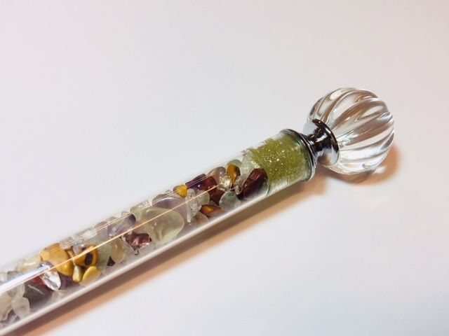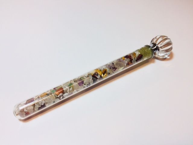 Der Stab ist 19cm lang und hat an einem Ende eine wunderschöne von mir persönlich energetisierte Glaskugel zur Wirkverstärkung.
