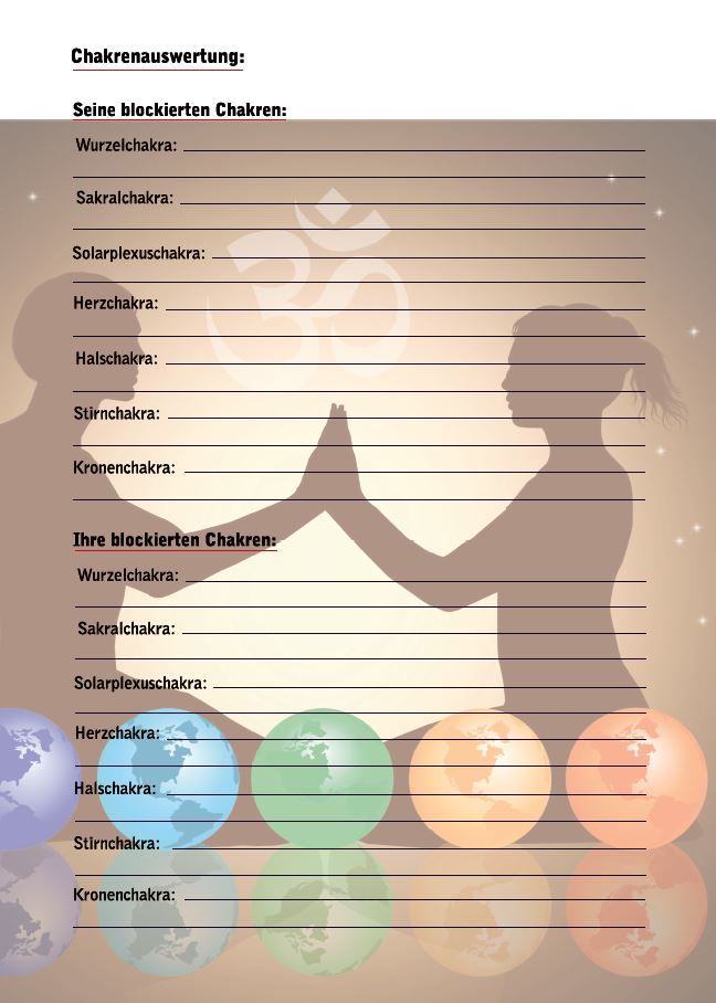 Mit dieser Schablone, können Sie sich nun alle Fragen selbst beantworten, auch wenn Sie noch nie etwas über Chakren gehört haben. Denn es gibt nichts schlimmeres, als das sog. Gedankenkarussell. Sich ständig die gleichen Fragen zu stellen, ohne ein plausible Antwort zu erhalten. Und somit evtl. in eine Abhängigkeit zu rutschen und jeden Tag mehrere Berater anzurufen, nur um am Ende des Tages festzustellen, dass Sie genauso schlau sind wie vorher.