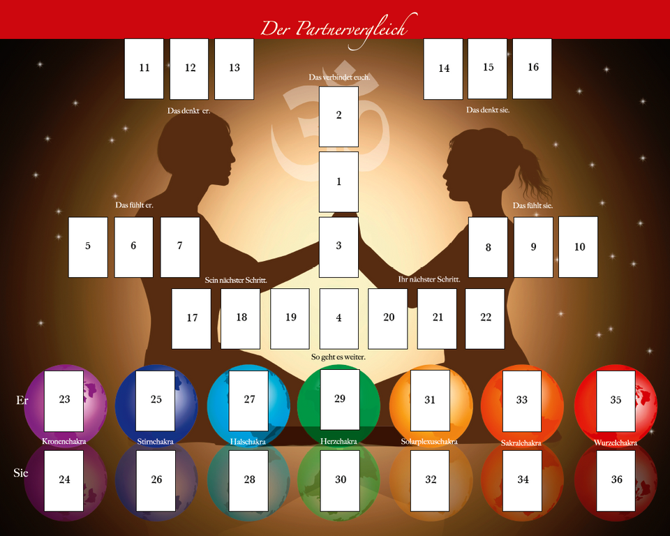 Und genau deshalb, um das Verhalten Ihres Wunschpartners zu verstehen und genau zu durchleuchten, damit Sie im Endeffekt Klarheit, Sicherheit und Ihre Stärke wieder zurück bekommen, wurde diese Legeschablone erfunden. Sie können sie mit allen Karten verwenden, die auf dem spirituellen Markt zu finden sind.