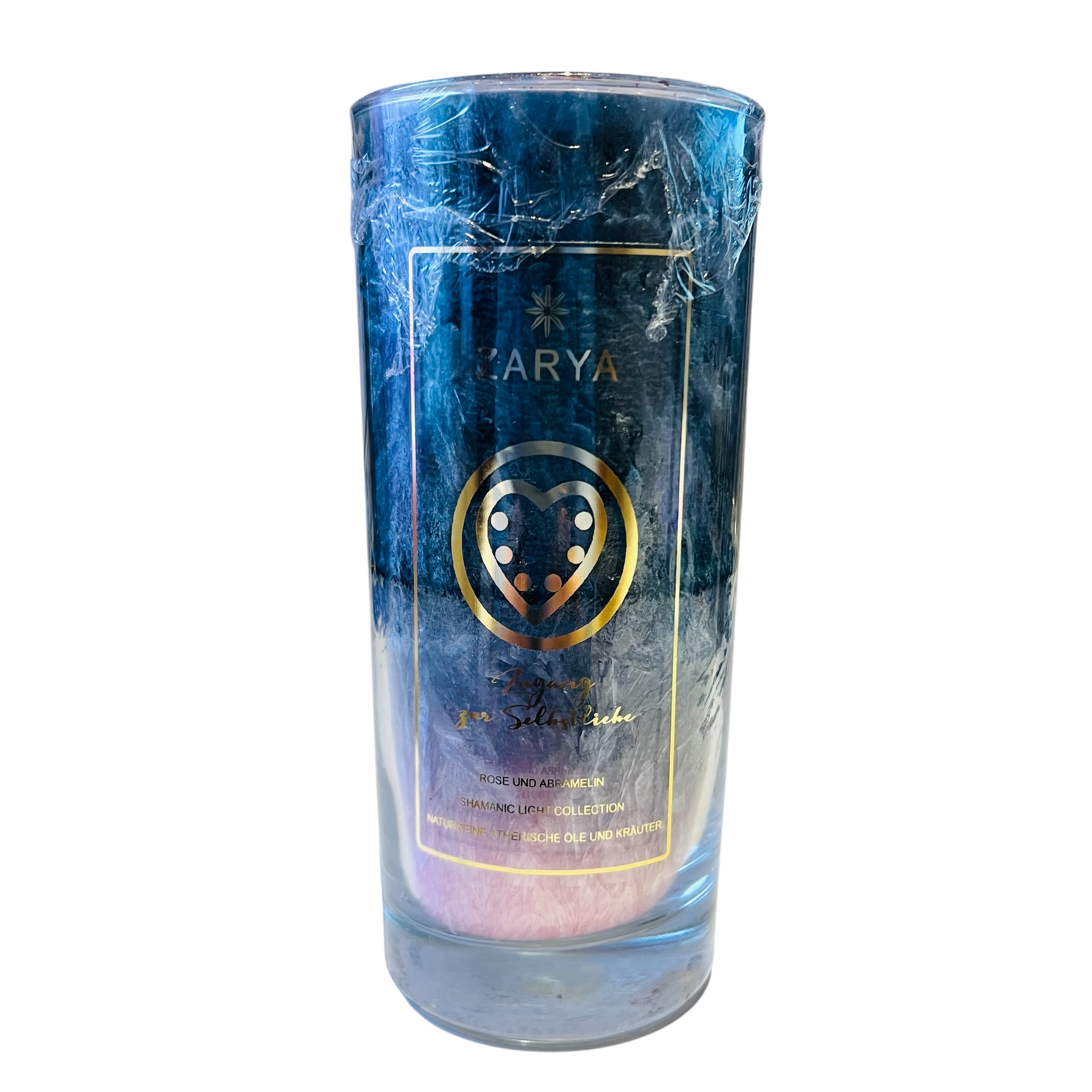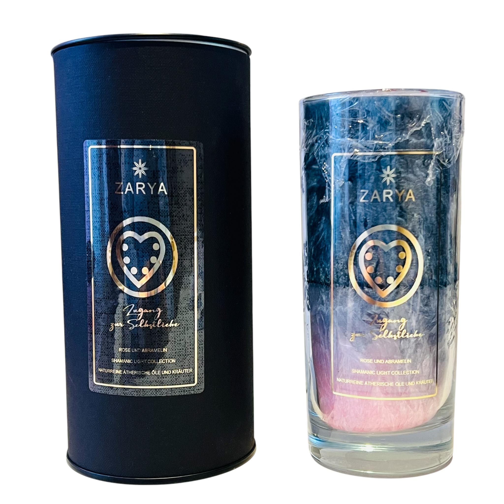 Die Kerze "Zugang zur Selbstliebe" duftet nach Rose und Abramelin.