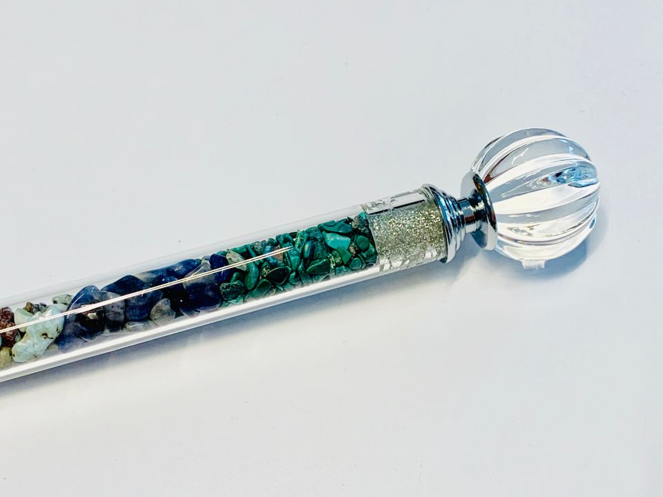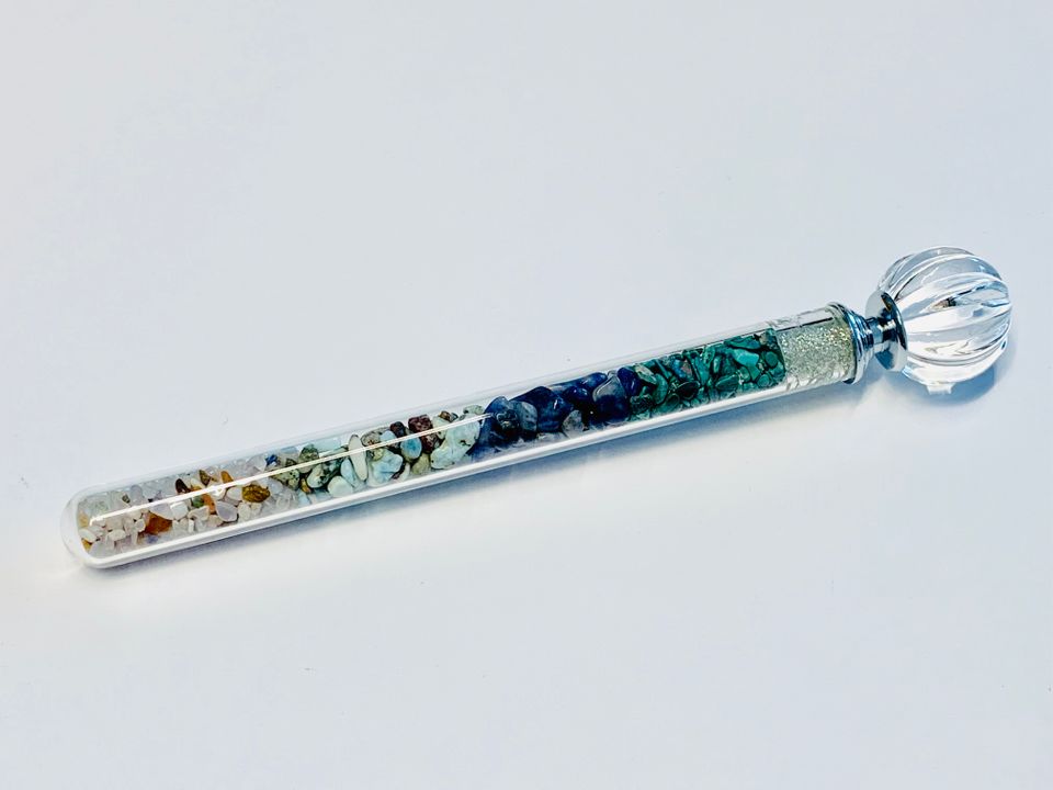 Der Stab ist 19cm lang und hat an einem Ende eine wunderschöne von mir persönlich energetisierte Glaskugel zur Wirkverstärkung.