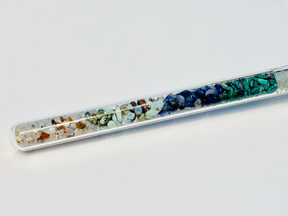 Dieser Energiestab mit ECHTEN Edelsteinen, ist nicht nur wunderschön und hochenergetisch, sondern auch besonders wirkungsvoll. In diesem Stab ist echter Malachit, Sodalith, Larimar und Chalcedon enthalten.